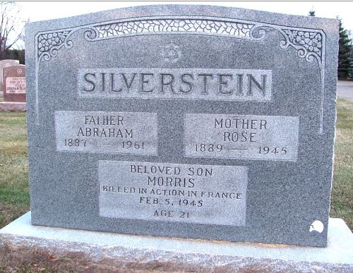 Pfc Morris Silverstein graduated from South High School and was employed at the Northwestern Woolen Company before he enlisted in April 1942.He is remembered at the B'Nai Emet Cemetery in Richfield, Hennepin County, Minnesota.