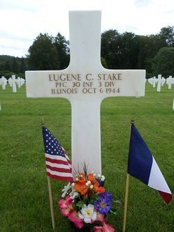 Pfc Eugene C. Stake attended high school for one year and was employed by the National Cooperage on a shipyard in Seneca, Illinois.He was married to Roma Soloman on 17 May 1941.