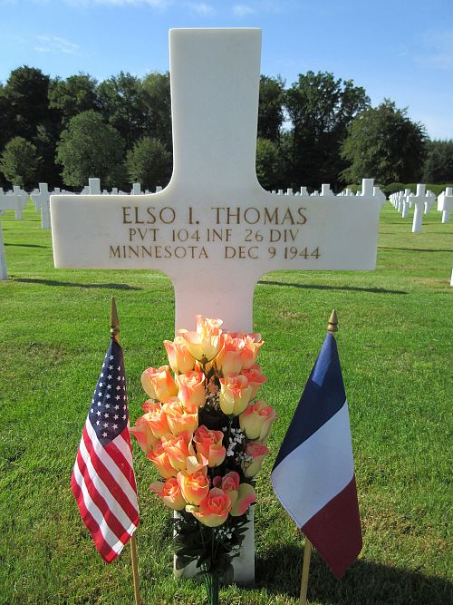 Pvt Thomas died of wounds received on 3 December 1944. He was first buried at the Temporary American Military Cemetery in Solers, France.