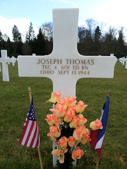 T/4 Joseph E. Thomas and the entire crew was killed when his M-10 tank destroyer was knocked out by an 88mm shell.He was first buried at the Temporary American Military Cemetery in Saint-Juan, France.