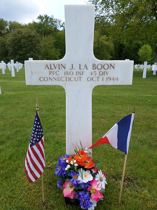 Pfc Alvin J. La Boon attended high school for 3 years before he enlisted in Hartford, Connecticut on 9 April 1943.He was first buried at the Temporary American Military Cemetery in Saint-Juan, France.