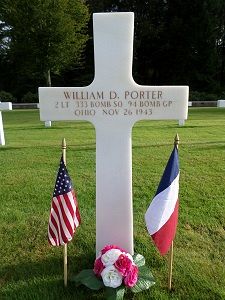 2nd Lt William D. Porter enlisted at the Lockbourne AAB, Columbus, Ohio on 3 April 1942.The mission to attack this area was reportedly officially aborted upon arrival on target due to complete cloud cover which totally obscured the target. The mission records report the weather over target as 10/10 cloud coverage, and visibility poor. They could not see to drop bombs without endangering civilian population [which they were more careful of in France], but the danger from attacking enemy aircraft was still as great and they were attacked by German fighter aircraft and German AA ground batteries as they circled the area coming and going. The record indicates that they were en route to the alternate target Hamm, Germany when they crashed. Crewman on the plane report that they were hit at least twice by German Fighter AC [likely by 20 MM cannon but the report does not indicate this] just before crossing the target area or just after. It appears that the waist area and the front area of the AC received direct hits from German cannon fire. This affected the two waist gunners, two pilots and navigator. Surviving crewman indicate that the damaged AC left the formation in the turn away from the target area. This is likely when the AC went out of control. Crewmen report the plane descending slowly in a spiral. Both pilots may have been wounded. They did not hear a bail out order, so each crewman took it upon himself to bail out when he saw the plane descending. The B-17G 42-37815 that 2nd Lt Porter was flying on crashed in the Belleville neighborhood of Paris. Out of the ten crew members on the aircraft, 5 were KIA, 3 became POWs, and 2 crew members were evacuated out of the county by the French underground. He reportedly was serious wounded by German 20 mm cannon fire, but was able to bail out, probably without a chute.