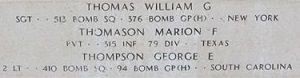 2nd Lt George E. Thompson was serving as the co-pilot on a B-17G which took off from Bury St. Edmunds with an assigned target of Munich, Germany. The aircraft was first hit by flak in the No 1 engine and the a second later another flak hit near the flight deck and the pilot ordered all the crew to bale out. Then there were explosions and the B-17 went down into a spin and blew up. It crashed 220yards SW of Gunzenhausen, about 12 miles north of Munich City Center. 6 KIA 3 POW Three of the KIA were executed on the orders of the Kreisleiter and buried in a bomb crater near the autobahn.Lt Thompson was officially declared dead one day and one year after he was reportec missing in action.