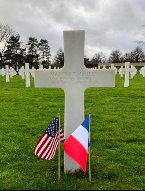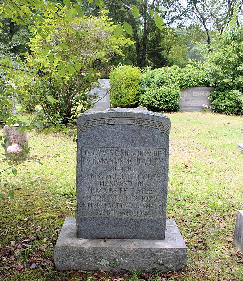 Pvt Mason E. Bailey was employed at the Swan Chemical Company before he enlisted at Fort McClellan, Alabama on 5 September 1944.He is also remembered at the Acton Memorial Cemetery in Birmingham, Jefferson County, Alabama.