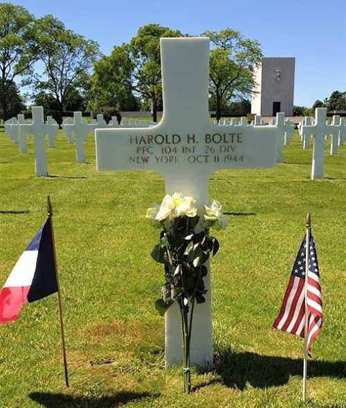 Pfc Harold H. Bolte was a student before he enlisted.He was first buried at the Temporary American Military Cemetery in Andilly, France.