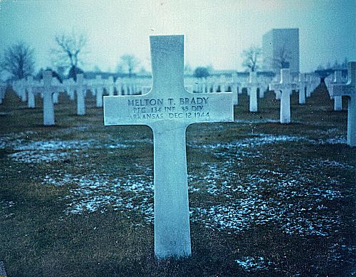 Pfc Melton T. Brady was raised on a farm near Walnut Ridge, Arkansas before he enlisted in Little Rock, Arkansas on 1 September 1942. He was sent overseas on 18 May 1944.Source of information: Peter Schouteten, www.abmc.gov, www.wwiimemorial.com, www.archives.gov - WWII Enlistment Record, www.ancestry.com - Headstone and Interment Record / U.S. WWII Draft Cards Young Men, After Action Report 35th Infantry Division, www.findagrave.com - BD Ledbetter, www.newspapers.com - The Courier News - 4 January 1945