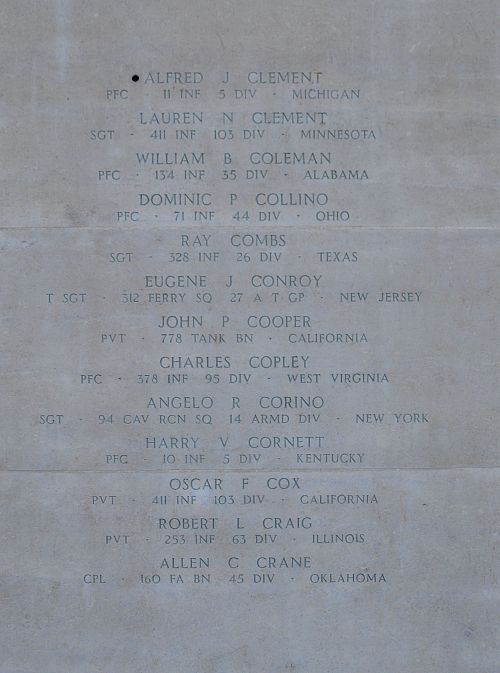 Pfc William B. Coleman was a welder and flame cutter before he enlisted at Fort McClellan, Alabama on 17 April 1943.Source of information: Peter Schouteten, www.abmc.gov, www.wwiimemorial.com, www.archives.gov - WWII Enlistment Record, www.ancestry.com - U.S. WWII Draft Cards Young Men / Victory Presley Family Tree, After Action Report 35th Infantry Division, www.findagrave.com - Coleman