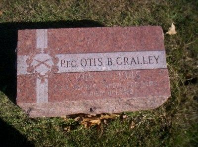 Pfc Otis B. Cralley entered service 25 May 1944, and received his training at Camp Hood, Texas. Early in December of 1944 he was sent overseas.He is remembered at the Mount Zion General Baptist Cemetery in Wabash Point, Coles County, Illinois.