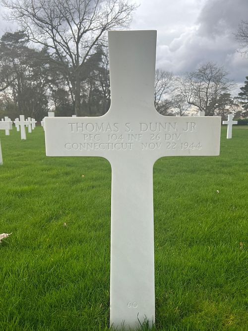 Pfc Thomas S. Dunn Jr. attended college for one year before he enlisted in New Haven, Connecticut on 18 August 1943.He was first buried at the Temporary American Military Cemetery in Limey, France.