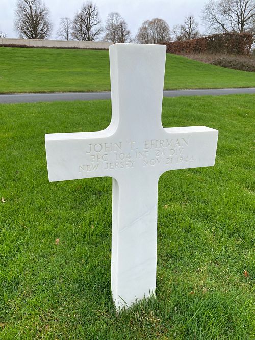 Pfc John T. Ehrman attended high school for four years and was employed at the New York Ship Building Corporation before he enlisted in Camden, New Jersey on 9 February 1943.He was first buried at the Temporary American Military Cemetery in Limey, France.