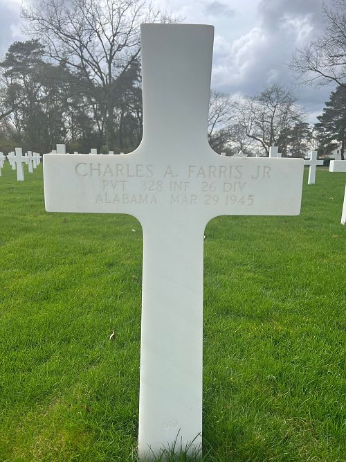 Pvt Charles A. Farris Jr. joined the U.S. Army Reserve at Camp Shelby, Mississippi on 12 September 1944. He was sent overseas in February 1945.Source of information: Peter Schouteten, www.abmc.gov, www.wwiimemorial.com, www.archives.gov - WWII Enlistment Record, www.ancestry.com - Headstone and Interment Record / 1930 Census, www.findagrave.com, www.fold3.com - 26th Infantry Division