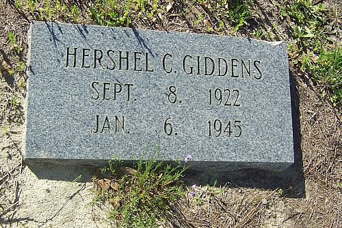 Pfc Hershel C. Giddens attended high school for two years and worked on a farm before he enlisted at Fort McPherson Atlanta, Georgia on 22 September 1943.He is remembered at the Bethlehem Baptist Church Cemetery in Irwin County, Georgia.