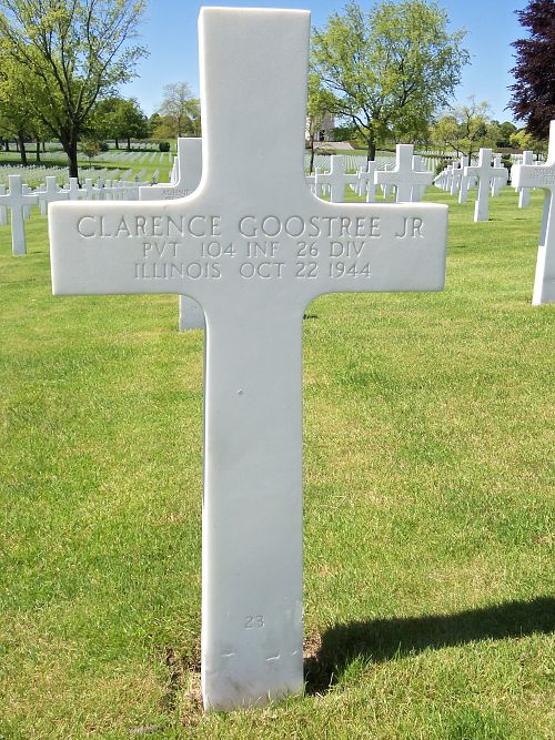 Pvt Clarence Goostree Jr. was employed at the Jack Philips Garage before he enlisted.Source of information: Peter Schouteten, www.abmc.gov, www.wwiimemorial.com, www.ancestry.com - Headstone and Interment Record / U.S. WWII Draft Cards Young Men / Roberta Jane Goostree Holmes Family Tree, www.findagrave.com, www.fold3.com - 26th Infantry Division