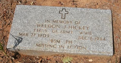 T/5 Weldon J. Hickey worked on a farm before he enlisted in Fort Sam Houston, Texas on 17 March 1942.He is also remembered at the Hickey Cemetery in Hillsboro, Hill County, Texas.