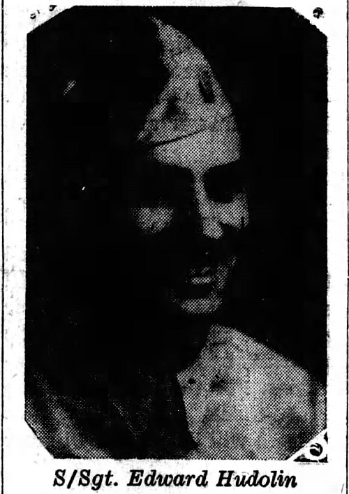 S/Sgt Edward Hudolin attended high school for four years and was a mechanic, employed by the White Motor Company, before he enlisted in Cleveland, Ohio on 26 October 1943.In November 1944, he was wounded in action in France by artillery shell fragments in his arm. He was hospitalized until December.