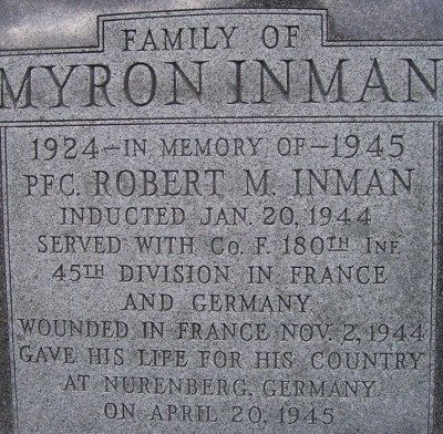 Pfc Robert M. Inman attended Vinton high school for 3 years before he enlisted in Camp Dodge Herrold, Iowa on 20 January 1944.He was wounded in France 2 November 1944.