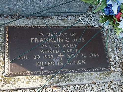 Pvt Franklin C. Jess worked on a farm before he enlisted at Fort Benjamin Harrison, Indiana on 31 March 1944.He was killed by artillery shell fragments.
