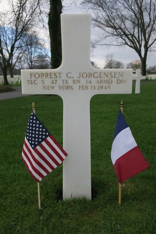 T/5 Forrest C. Jorgensen attended high school for two years and was in the trucking business with Howard Williams before he enlisted in Rochester, New York on 2 December 1942. He was sent overseas in November 1944.He died in a German hospital after he was reported missing in action on the same day.