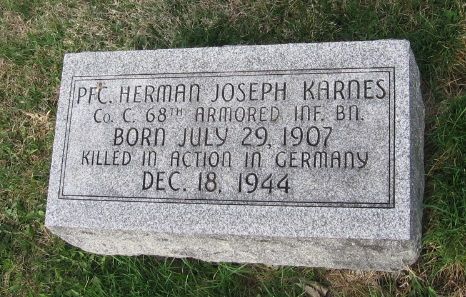 Pfc Herman J. Karnes is remembered at the Sunset Hill Cemetery in Madison, Monroe County, Missouri.Source of information: Peter Schouteten, www.abmc.gov, www.wwiimemorial.com, www.ancestry.com - Headstone and Interment Record / Maxey Storm Family, www.findagrave.com - P. Shannon, http://14thad.org