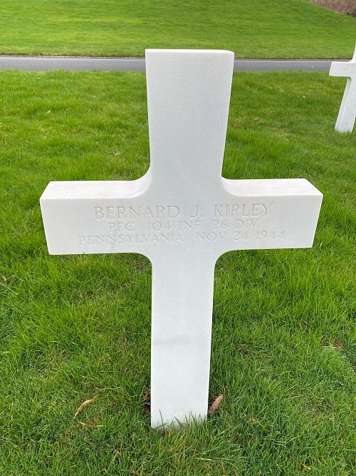 Pfc Bernard J. Kirley was employed at the Jones & Laughlin Steel Corporation before he enlisted in New Cumberland, Pennsylvania on 20 March 1944. He was sent overseas on 1 September 1944.He was killed by shell fragments in his chest.