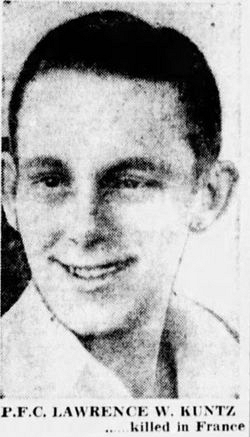 Pfc Lawrence W. Kuntz attended high school for four years and was a retail manager, employed by the Isaly Dairy Company, before he enlisted in Cleveland, Ohio on 8 December 1943.He was killed by artillery shell fragments in the abdomen.