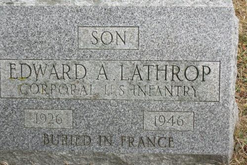 Cpl Edward A. Lathrop is remembered at the East Berlin Cemetery in St. Clair County, Michigan.Source of information: Peter Schouteten, www.abmc.gov, www.wwiimemorial.com, www.ancestry.com - Headstone and Interment Record / Simmons Family Tree, www.findagrave.com – Joan Wright Romero