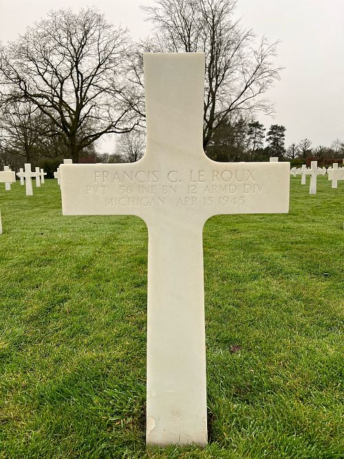 Pvt Francis C. Le Roux attended high school for three years before he enlisted at Fort Sheridan, Illinois on 20 July 1944.Source of information: Peter Schouteten, Kathy McDermott, www.abmc.gov, www.wwiimemorial.com – A Grateful American, www.archives.gov – WWII Enlistment Record, www.ancestry.com - Headstone and Interment Record / U.S. WWII Draft Cards Young Men / Michigan Marriage Records / Tronge Family Tree, www.12tharmoredmuseum.com, www.findagrave.com