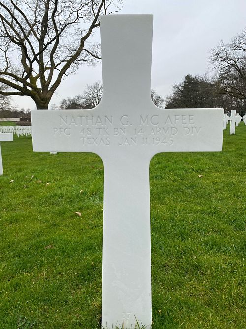 Pfc Nathan G. McAfee graduated from Corsicana High School and attended North Texas State Teachers College for one year.He joined the U.S. Army Reserve in Dallas, Texas on 8 November 1942.