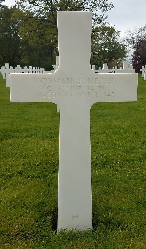 Pfc Norman J. Meyer joined the National Guard in Sparta, Wisconsin on 15 October 1940. After his discharge in November 1941, he was called up one year later. He was sent overseas in June 1944.His brother Robert served with the U.S. Navy in the Philippines and his brother John was stationed in Jacksonville, Florida at the time of his death.