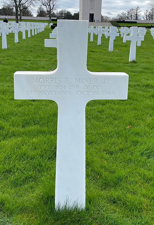Pvt Morris E. Miner Jr. attended high school for four years before he joined the U.S. Army Reserve in Erie, Pennsylvania on 7 June 1943.He was first buried at the Temporary American Military Cemetery in Andilly, France.