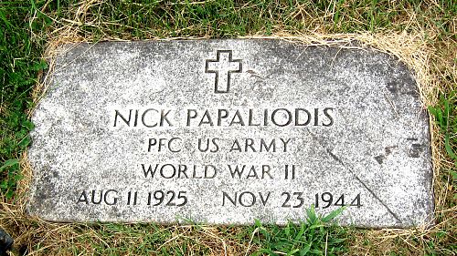 Pfc Nick Papaliodis attended Ohio University in Athens, Ohio for one year before he joined the U.S. Regular Army Reserve at Fort Benjamin Harrison, Indiana on 14 February 1944.He is remembered at the Upland Heights Cemetery in Warren Township, Jefferson County, Ohio.