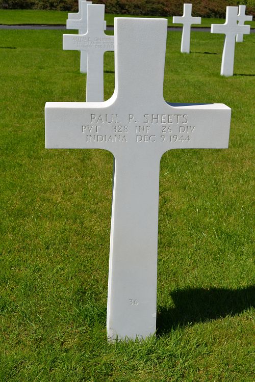 Pvt Paul P. Sheets attended high school for four years and was employed at the Estey Piano Company before he enlisted at Fort Benjamin Harrison, Indiana on 22 April 1944. He was sent overseas in October 1944.He was killed by artillery shell fragments in his neck.