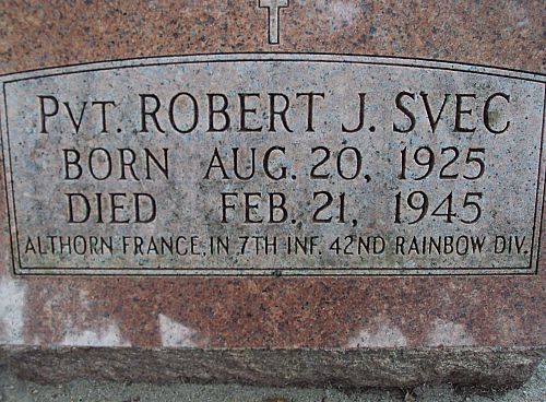 Pvt Robert J. Svec attended high school for four years and worked on a farm before he enlisted at Fort Leavenworth, Kansas on 28 July 1944. He was sent overseas in January 1945.He is remembered at the Schuyler Cemetery in Schuyler, Colfax County, Nebraska.