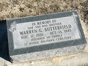 Sgt Warren G. Butterfield enlisted in Pocatello, Idaho on 22 August 1942.In the Individual casualty questionaire, Left Waist Gunner Sgt. Robert W. Thomas stated that Warren Butterfield never bailed out because he was badly wounded or already dead.