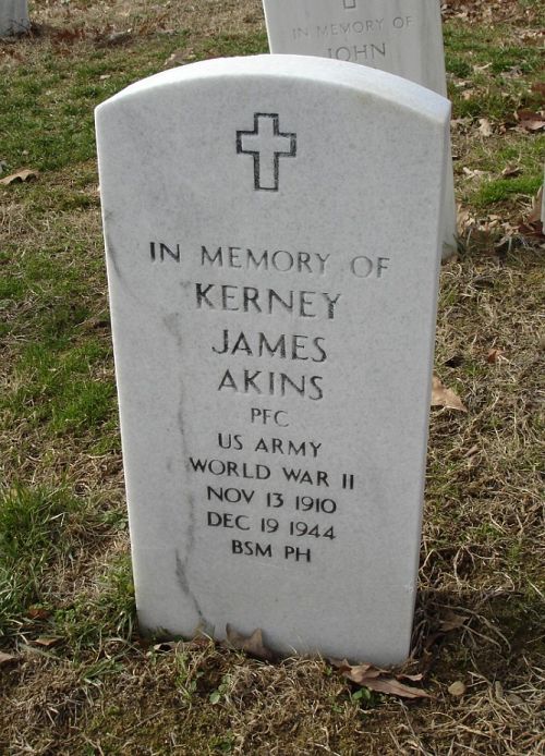 Pfc Kerney J. Akins is remembered at Arlington National Cemetery in Arlington, Virginia and at the Gill Cemetery in Van Buren, Crawford County, Arkansas.Source of information: Peter Schouteten, Carla Mans, www.abmc.gov, www.wwiimemorial.com, www.ancestry.com - U.S. WWII Draft Cards Young Men, www.findagrave.com - Shiver / MAJ Jimmy Cotton / Noma Kelton Henderson, Combat History 79th Infantry Division