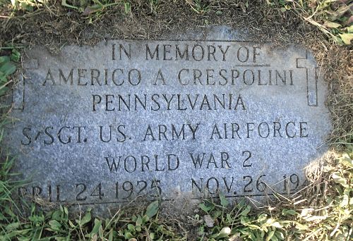 S/Sgt Americo A. Crespolini enlisted in Wilkes Barre, Pennsylvania on 7 August 1943.The airplane was jumped by fighters after bombs away and started going down. It was not on fire and seemed under control.
