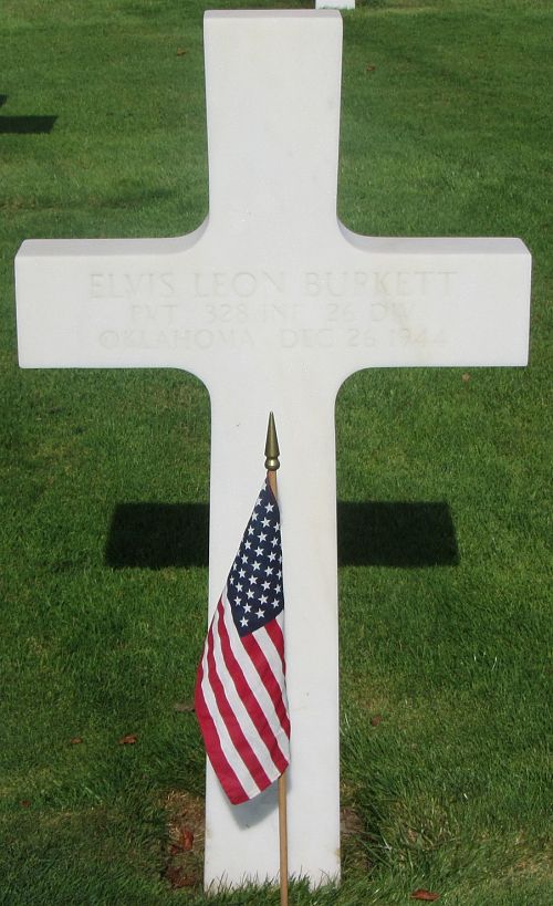 Pvt Elvis L. Burkett was first buried at the Temporary American Military Cemetery in Grand-Failly, France.Source of information: Peter Schouteten, www.abmc.gov, www.wwiimemorial.com, www.ancestry.com - Headstone and Interment Record / U.S. WWII Draft Cards Young Men / Carole McWaters Family Tree / 1940 Census, www.fold3.com - 26th Infantry Division