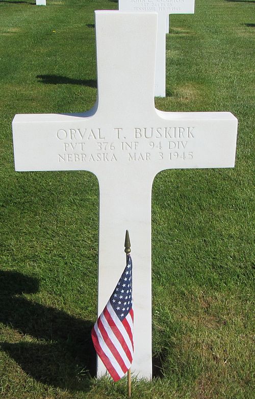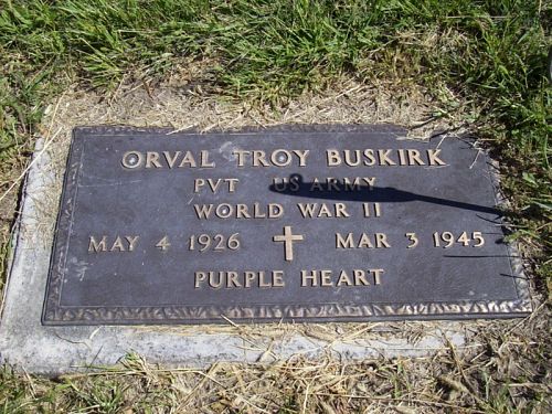 Pvt Orval T. Buskirk enlisted at Fort Leavenworth, Kansas on 22 August 1944. He was sent overseas in January 1945.He is remembered at the Rivervieuw Cemetery in Louisville, Cass County, Nebraska.