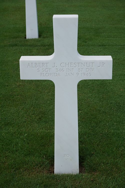S/Sgt Albert J. Chestnut attended high school for four years and was a routeman before he enlisted at Camp Blanding, Florida on 16 February 1943.He was first buried at the Temporary American Military Cemetery in Grand Failly, France.