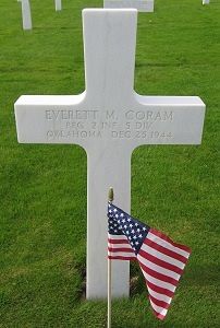 Pfc Everett M. Coram enlisted in Los Angeles, California on 24 August 1942.He worked as a farmhand before he enlisted.