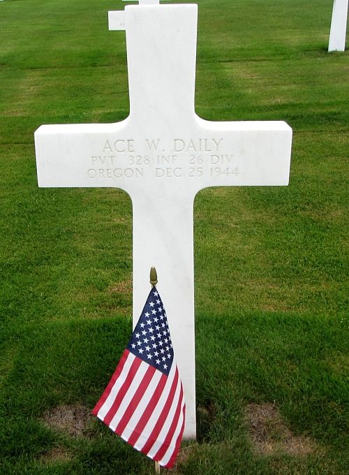 Pvt Ace W. Daily attended high school for four years and was a driver before he enlisted in Portland, Oregon on 19 January 1944. He was sent overseas in September 1944.Source of information: Peter Schouteten, www.abmc.gov, www.wwiimemorial.com, www.archives.gov – WWII Enlistment Record, www.ancestry.com - Headstone and Interment Record / U.S. WWII Draft Cards Young Men / Daily Swainston Family Tree, www.findagrave.com – Erick Ackerman, www.fold3.com – 26th Infantry Division