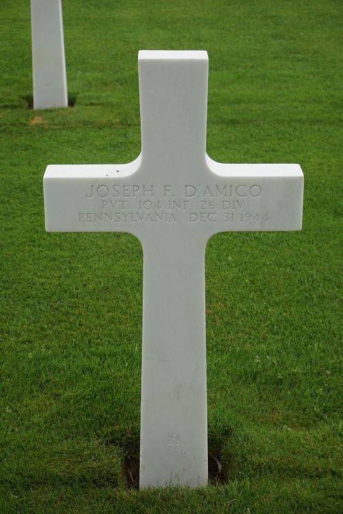 Pvt Joseph F. D'Amico attended high school for three years before he enlisted in Philadelphia, Pennsylvania on 15 April 1943.Source of information: Peter Schouteten, www.abmc.gov, www.wwiimemorial.com, www.archives.gov - WWII Enlistment Record, www.ancestry.com - Headstone and Interment Record / U.S. WWII Draft Cards Young Men / Pugliese Family Tree, www.findagrave.com, www.fold3.com - 26th Infantry Division
