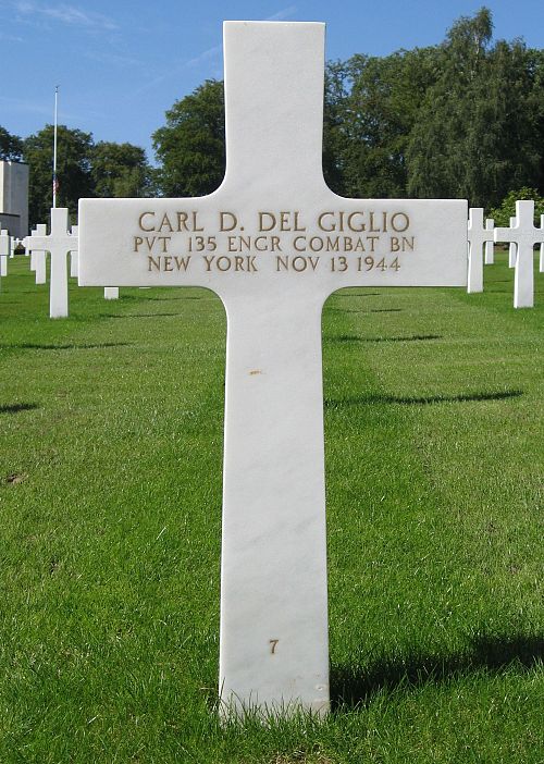 Pvt Carl D. Del Giglio was a laboratory technician and assistant at Craft Dental Lab before he enlisted at Camp Upton, New York on 12 March 1942.Source of information: Peter Schouteten, www.abmc.gov, www.wwiimemorial.com - Dorothy Marmo, www.archives.gov, www.ancestry.com - Headstone and Interment Record / U.S. WWII Draft Cards Young Men / Dwyer Family Tree, www.findagrave.com - R.C.