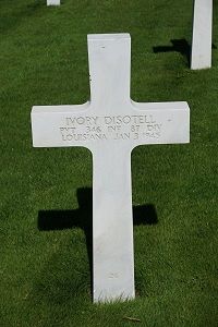 Pvt Ivory Disotell was first buried at the Temporary American Military Cemetery in Grand Failly, France.Source of information: Peter Schouteten, www.abmc.gov, www.wwiimemorial.com, www.ancestry.com - Headstone and Interment Record / Brenda Ganaway Family Tree, http://87thinfantrydivision.com, www.findagrave.com