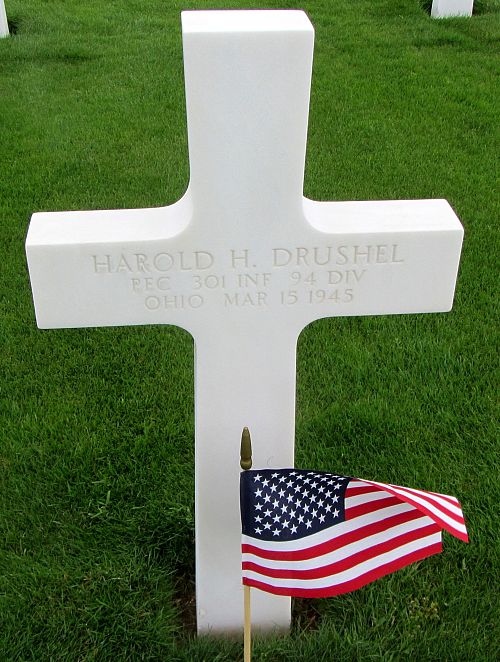 Pfc Harold H. Drushel attended high school for 1 year before he enlisted in Cleveland, Ohio on 2 September 1944.Source of information: Peter Schouteten, www.abmc.gov, www.wwiimemorial.com, www.archives.gov – WWII Enlistment Record, www.ancestry.com - Headstone and Interment Record / Evans McWilliams Tree / 1940 Census, http://www.94thinfdiv.com, www.findagrave.com