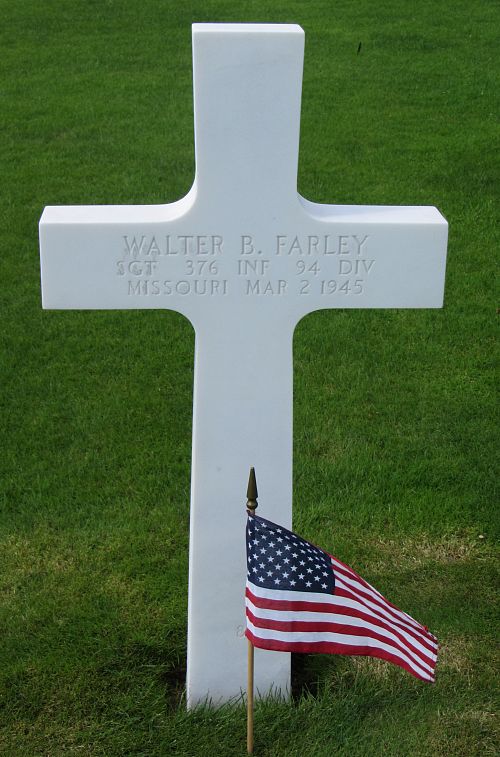 Sgt Walter B. Farley worked on a farm before he enlisted in Jefferson Barracks, Missouri on 18 November 1942.Source of information: Peter Schouteten, www.abmc.gov, www.wwiimemorial.com, www.archives.gov - WWII Enlistment Record, www.ancestry.com - Headstone and Interment Record / U.S. WWII Draft Cards Young Men / 1940 Census, http://www.94thinfdiv.com