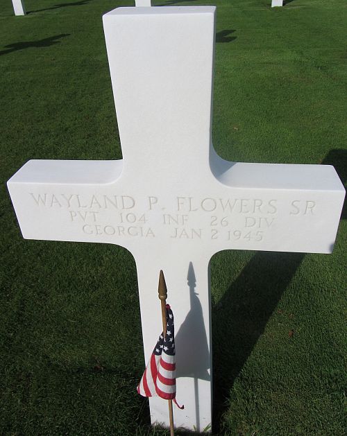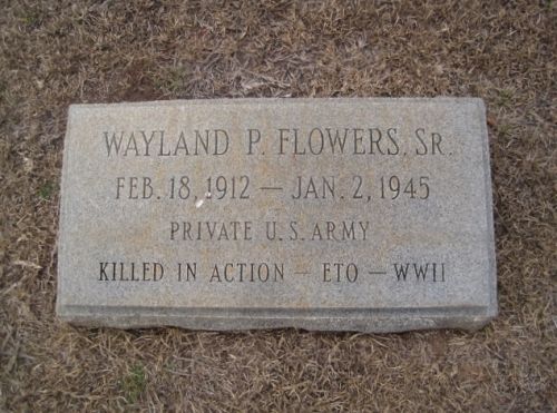 Pvt Wayland P. Flowers Sr. attended college for one year and was employed at the South Georgia Grocery Company before he enlisted at Fort McPherson, Georgia on 19 January 1944.He is remembered at the Cedar Hill Cemetery in Dawson, Terrell County, Georgia.