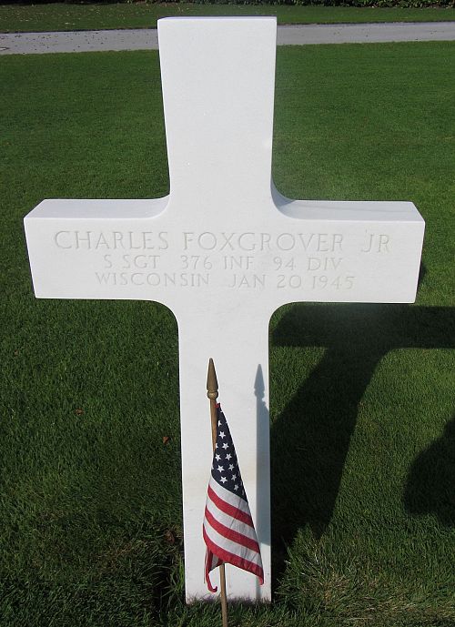 S/Sgt Charles Foxgrover attended college and was a welder and flame cutter before he enlisted in Milwaukee, Wisconsin, on 25 November 1942.On 18 January 1945 near Tettingen, Lt Peters and his platoon sergeant Joseph J. Quentz, were wounded by an 88mm gun and had to be evacuated. S/Sgt Charles Foxgrover then had his anti-tank gun crew get their 57mm gun firing on the tank behind the church at a range of three hundred yards, and they succeeded in knocking it out before it could turn its turret. However, a mortar shell then hit S/Sgt Foxgrover and most of the crew as they were changing position, wounding most of the men and jamming the trails of the gun. Foxgrover died in a hospital in France.