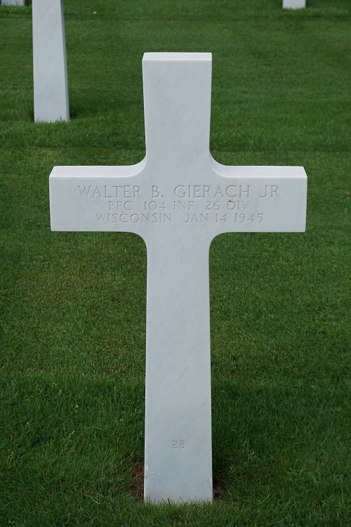 Pfc Walter B. Gierach Jr. was employed at the Gilbert Shoe Company before he enlisted in Milwaukee, Wisconsin on 21 December 1942.He died in a field hospital to the effects of small arms fire in his kidney.