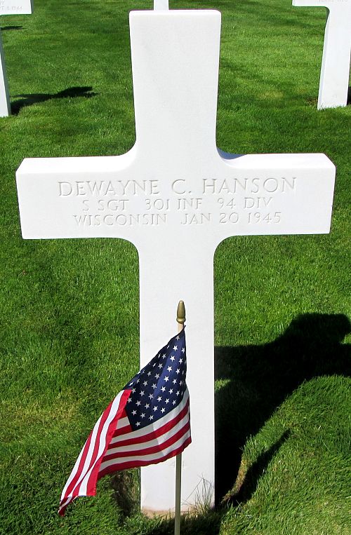 S/Sgt Dewayne C. Hanson attended high school for 1 year and was a county agent and farm demonstrator before he enlisted in Milwaukee, Wisconsin on 28 November 1942.Source of information: Peter Schouteten, www.abmc.gov, www.wwiimemorial.com, www.archives.gov – WWII Enlistment Record, www.ancestry.com - Headstone and Interment Record / Stodola Davis Blair Tree, http://www.94thinfdiv.com, www.findagrave.com
